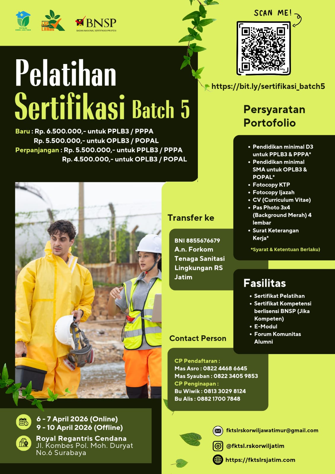 Forum Komunikasi Tenaga Sanitasi Lingkungan Rumah Sakit Indonesia Korwil Jawa Timur (FKTSLRSI Korwil Jawa Timur) Bekerja sama dengan LSP Lingkungan Hidup Nasional (LHNas) Menyelenggarakan Pelatihan dan Sertifikasi Pengawasan Pengolahan Limbah B3 (PPLB3), Operasional Pengolahan Limbah B3 (OPLB3), Penanggung Jawab Pengendalian Pencemaran Air (PPPA), Penanggung Jawab Operasional Pengolahan Air Limbah (POPAL), Jadwal Pelatihan : 6 &...